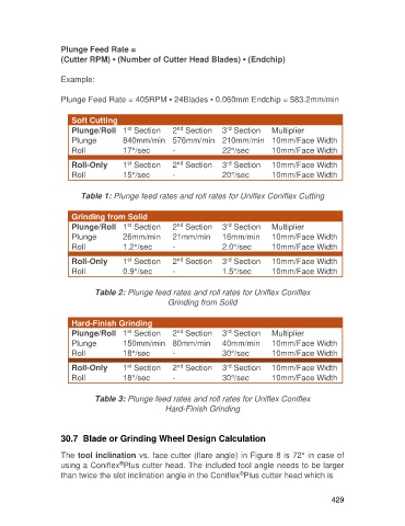Table 1: Plunge feed rates and roll rates for Uniflex Coniflex Cutting