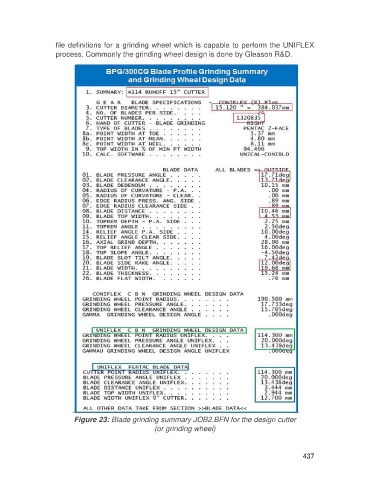 file definitions for a grinding wheel which is capable to perform the UNIFLEX process. Commonly the grinding wheel design is done by Gleason R&D. Figure 23: Blade grinding summary JOB2.BFN for the design cutter (or grinding wheel) 437
